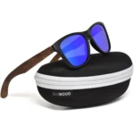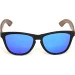 Classic walnut wood sunglasses with matte black acetate front and blue mirrored polarized lenses