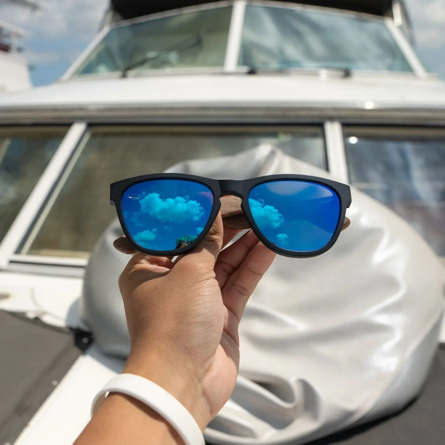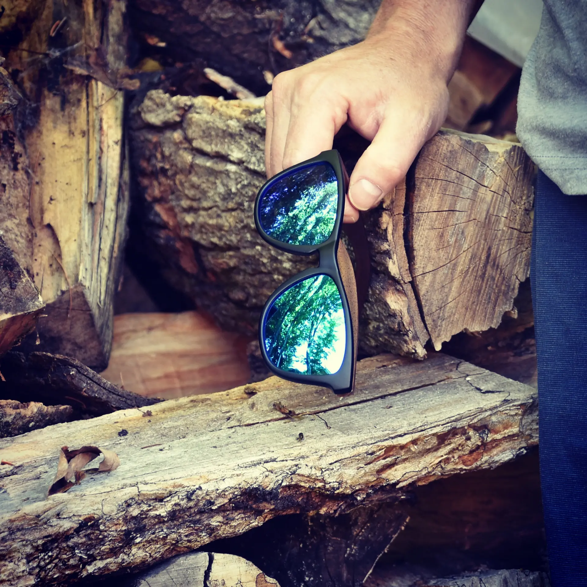 Classic walnut wood sunglasses with matte black acetate front and blue mirrored polarized lenses